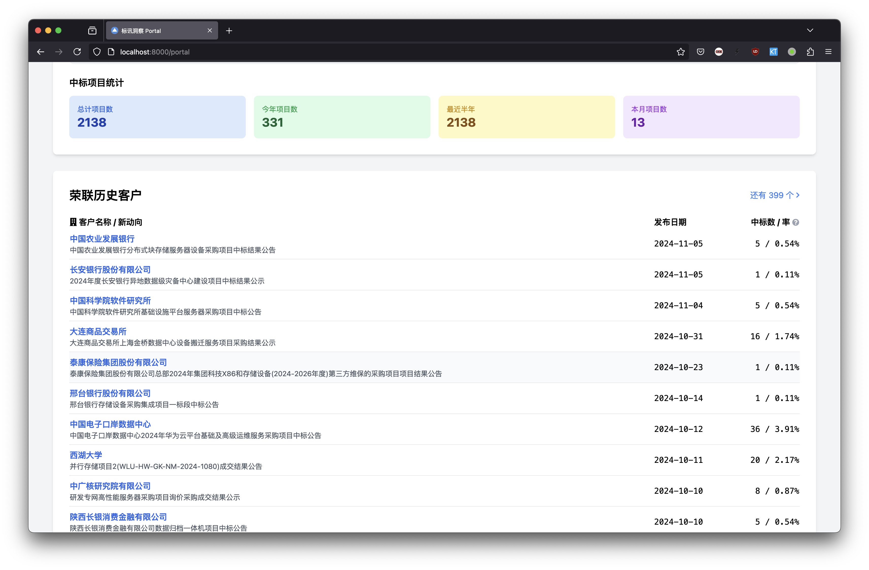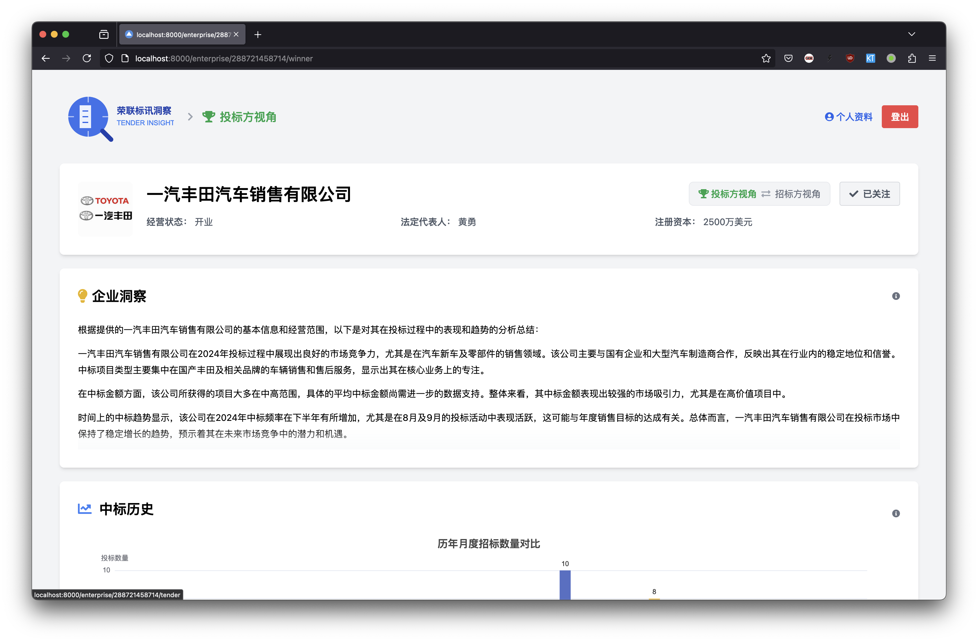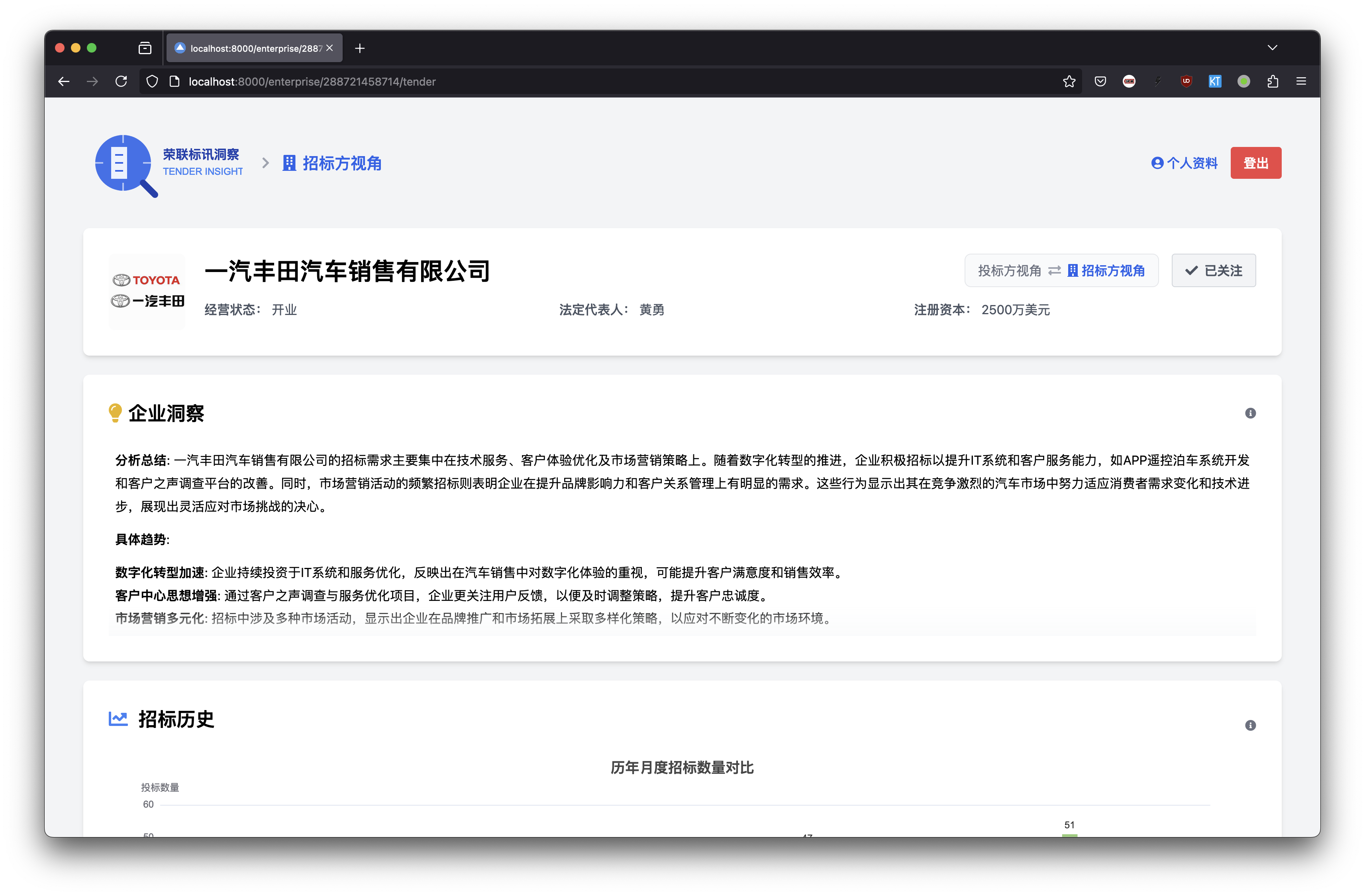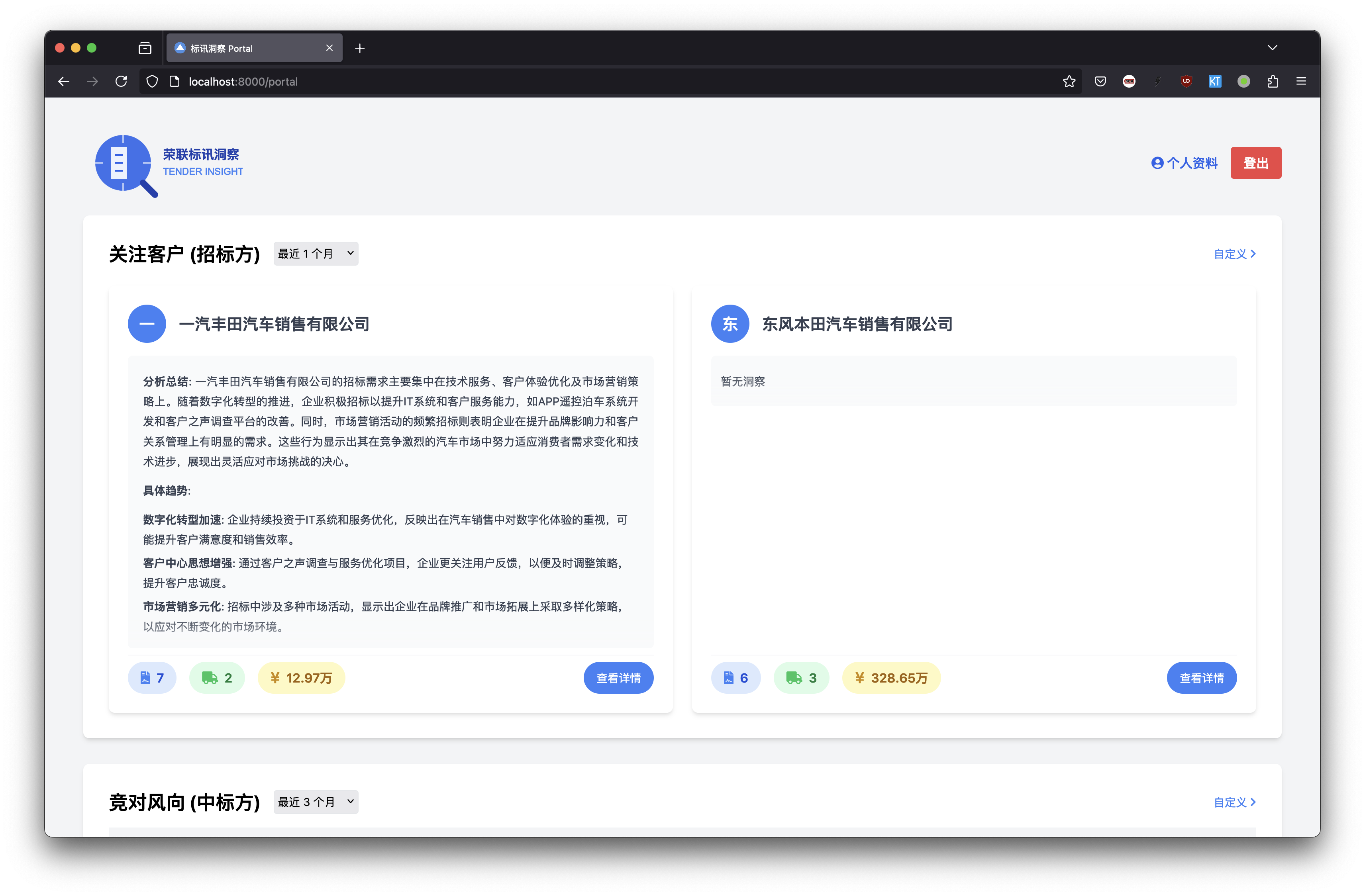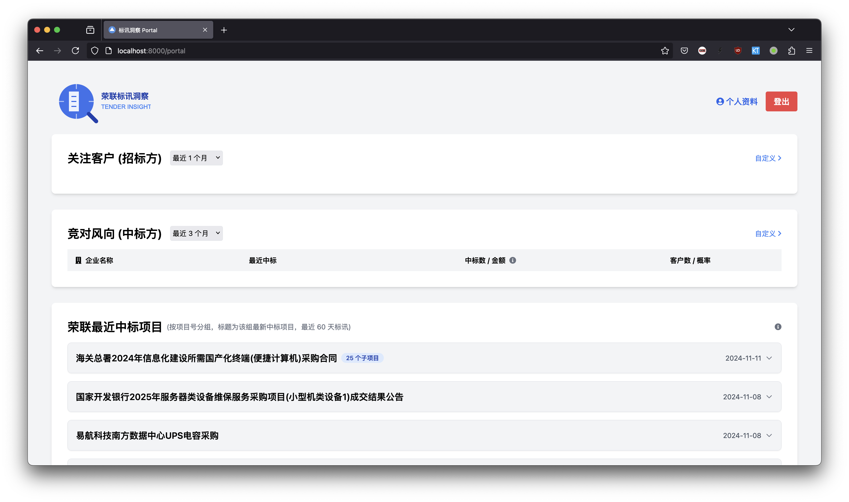 概述登录输入公司邮箱给你的邮箱发了一个登录邮件,点链接就能自动登录也可以使用验证码登录个人信息 & 关注企业「确认添加」关注企业有了「关注的企业」了,点左上角回「标讯洞察」主页↓看看标讯洞察主页在「个人资料」或在企业「招标方视角」关注了企业如果没有「关注的企业」是下面这样竞争对手(关注的「中标方」企业)最近中啥标了荣联最近中啥了,点击分组可展开荣联的历史客户,有啥新动向企业有两个洞察「视角」从首页或其它链接看「关注客户」,准备洞察数据洞察数据准备得差不多了,注意这是「招标方视角」真的准备好了,它会自动跳过去点击企业名称右侧的「投标方视角招标方视角」可以切换,它居然需要再准备一次数据数据又准备好了,跳过去核心供应商 or 主要客户,具体看是哪个「视角」下联系