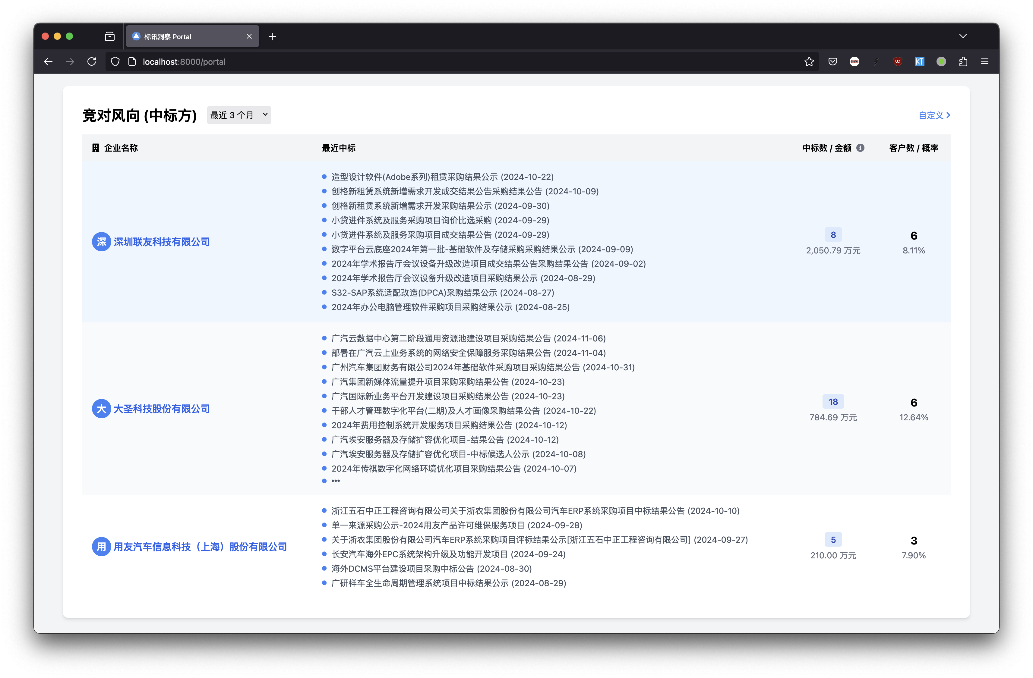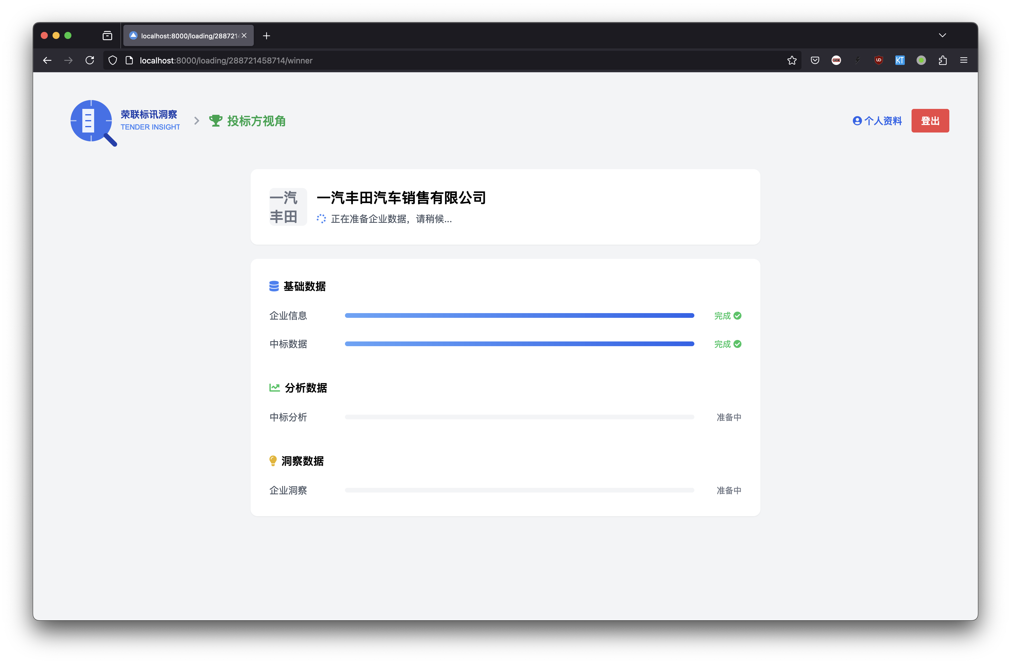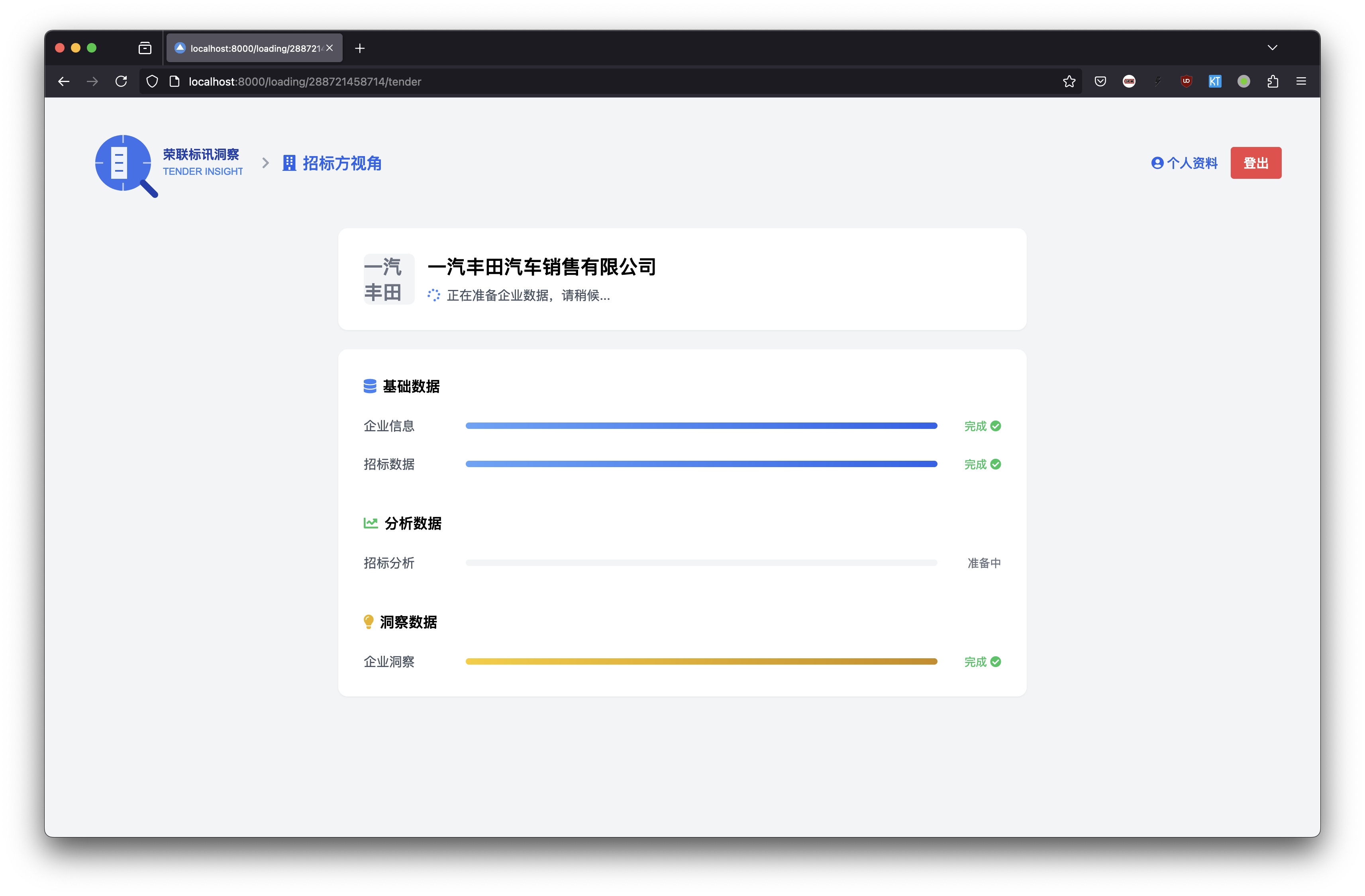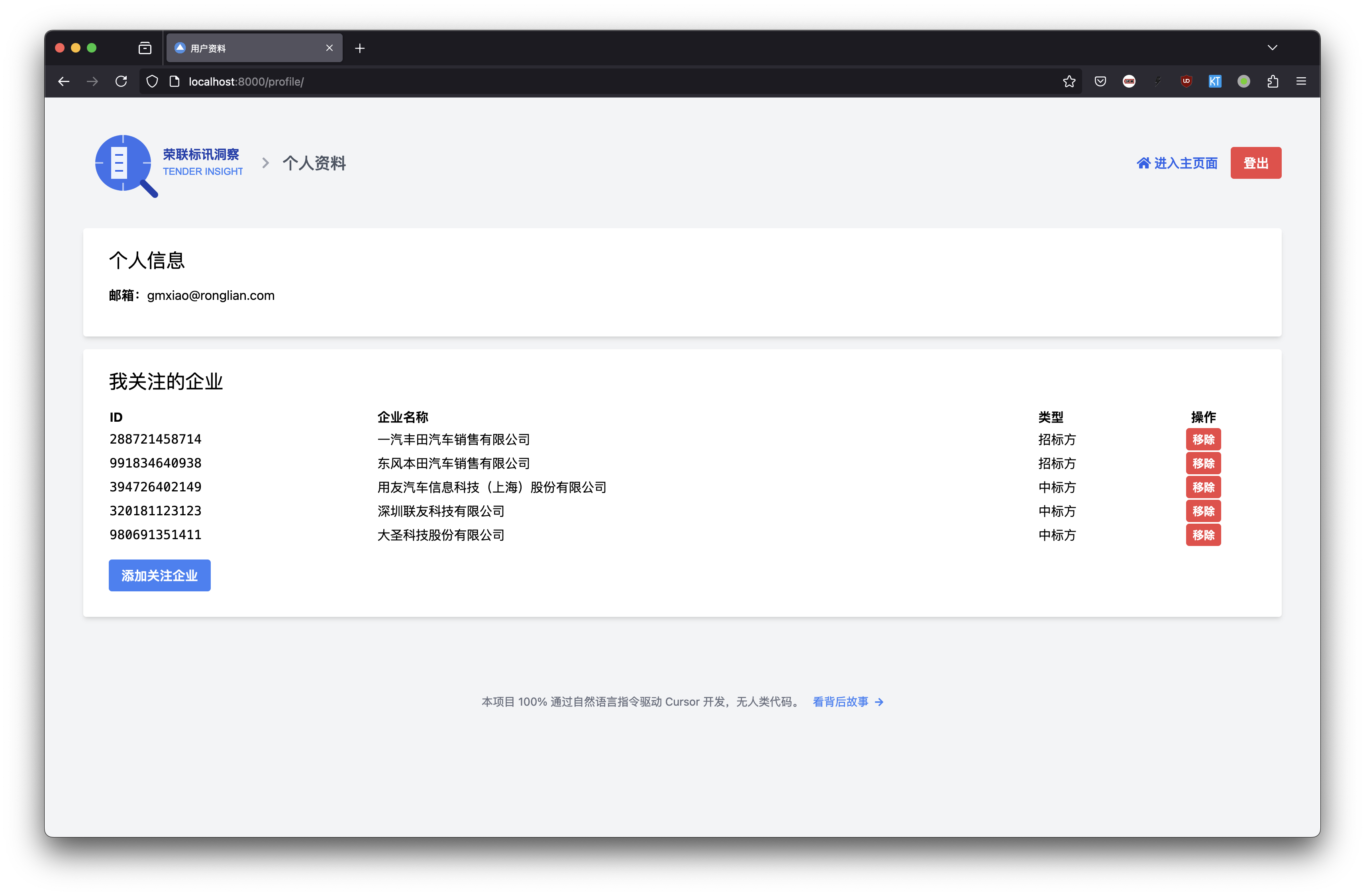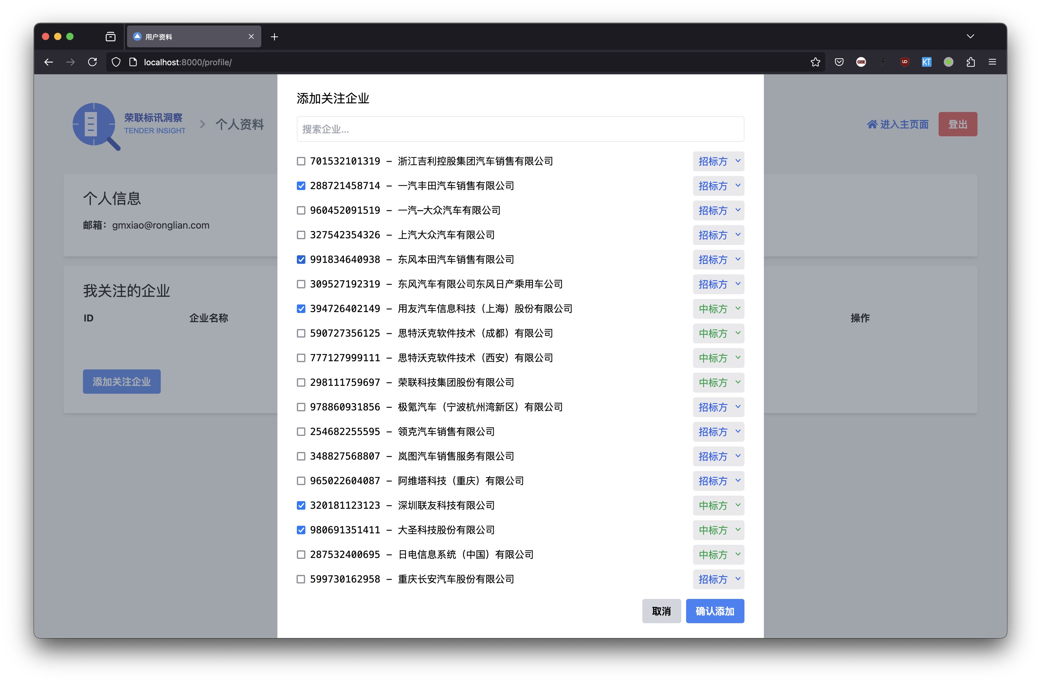 概述登录输入公司邮箱给你的邮箱发了一个登录邮件,点链接就能自动登录也可以使用验证码登录个人信息 & 关注企业「确认添加」关注企业有了「关注的企业」了,点左上角回「标讯洞察」主页↓看看标讯洞察主页在「个人资料」或在企业「招标方视角」关注了企业如果没有「关注的企业」是下面这样竞争对手(关注的「中标方」企业)最近中啥标了荣联最近中啥了,点击分组可展开荣联的历史客户,有啥新动向企业有两个洞察「视角」从首页或其它链接看「关注客户」,准备洞察数据洞察数据准备得差不多了,注意这是「招标方视角」真的准备好了,它会自动跳过去点击企业名称右侧的「投标方视角招标方视角」可以切换,它居然需要再准备一次数据数据又准备好了,跳过去核心供应商 or 主要客户,具体看是哪个「视角」下联系